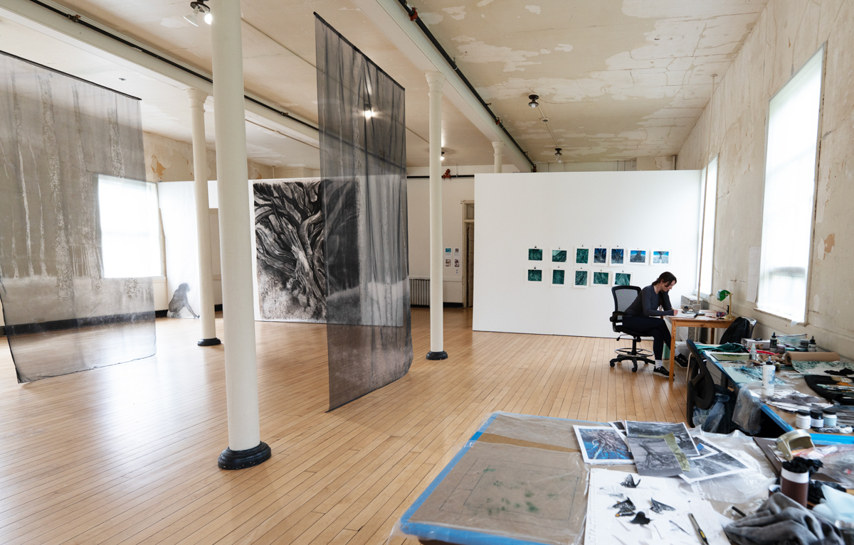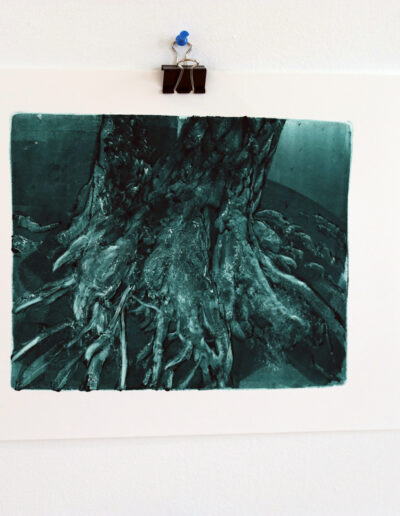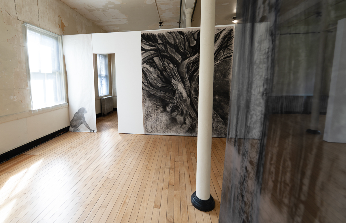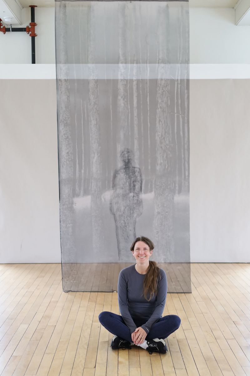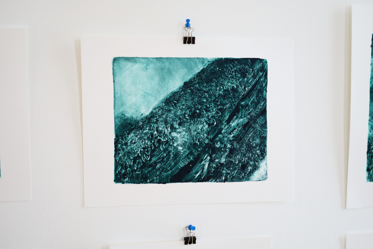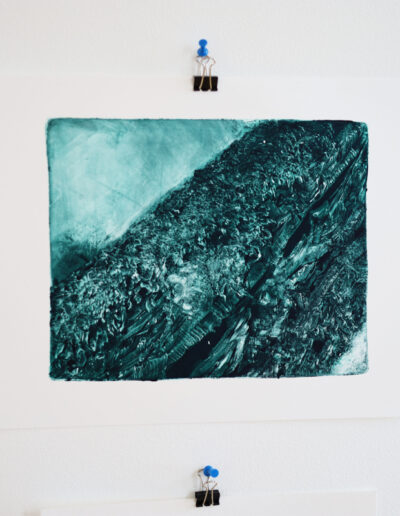 Colleen Blackard connects external and internal landscapes through monotype printmaking, drawing, and installation. Her artwork blends landscape and myth to create an otherworld for viewers to enter. As part of her process, she travels to remote sites and creates artwork to share her experiences of these places with the local community and abroad. Her installations envision humans as part of nature, belonging to the landscape, creating a space to contemplate this relationship.